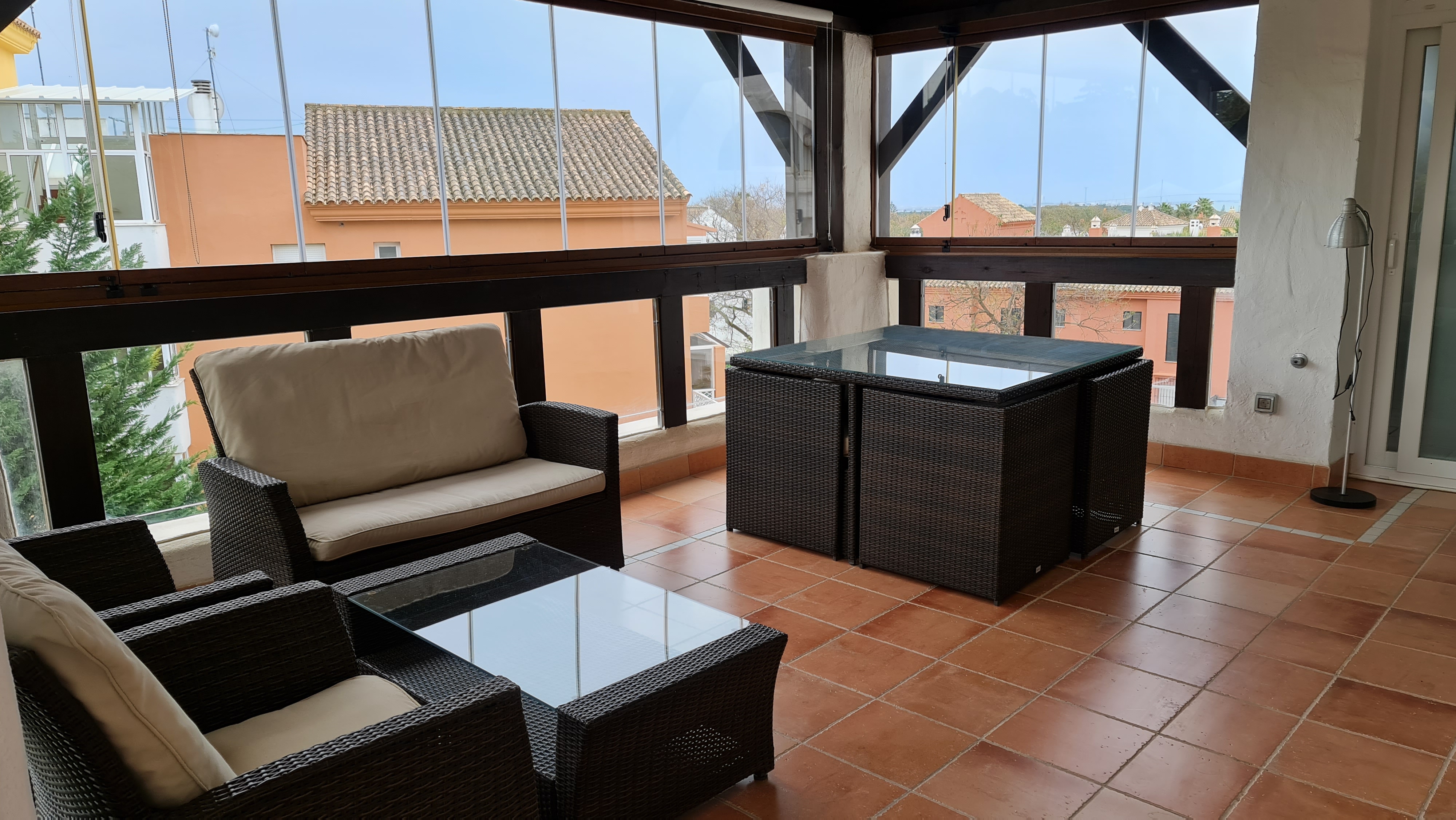 El apartamento tiene un amplio salón comedor, una magnífica terraza con cortinas de cristal, 2 dormitorios, 2 estupendos cuartos de baño, una moderna cocina y un cuarto lavadero.